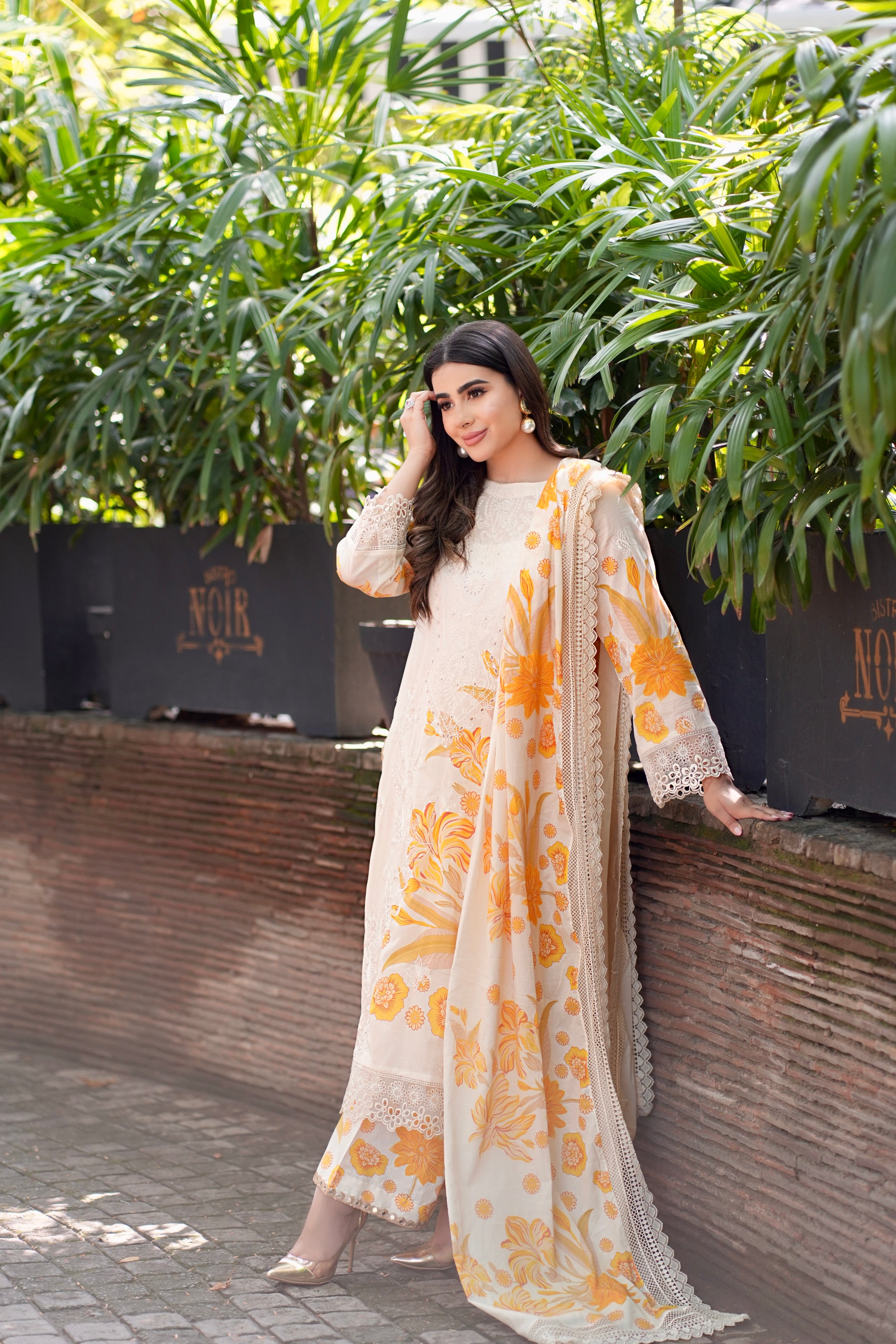 Presenting the elegant "Zaza" ensemble, a symphony of sophistication and floral delight. This stunning outfit features an off-white canvas, exquisitely adorned with intricate embroidery and delicate soft yellow floral patterns. The printed trousers enhance the ensemble's cohesive beauty, while the printed voile dupatta adds a touch of airy grace. Perfect for those who appreciate refined elegance and the allure of nature, the "Zaza" outfit is a true masterpiece of design and craftsmanship.